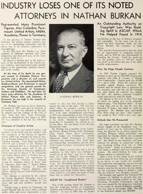 In 1916 Charlie Chaplin engaged Mr. Burkan to draw up his