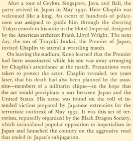 Premier of Japan, invited Chaplin to attend a wrestling match.