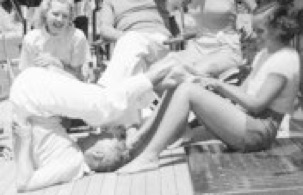 he keeps fit. Paulette Goddard is tickling his feet. The scene