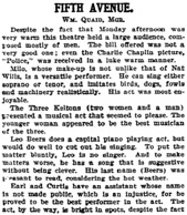 or tenor, and imitates birds, dogs, fowls and machinery realistically.