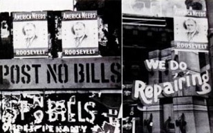& POST NO BILLS and „America Needs Roosevelt“ signs