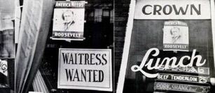 & WAITRESS WANTED and „America Needs Roosevelt“ sign