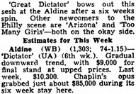 Aldine (WB) (1,303; 74-1.15) – Dictator (UA) (6th wk.).