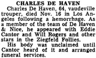 Charles De Haven, 64, vaudeville trouper, died Nov. 16