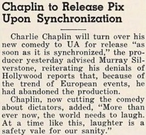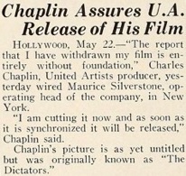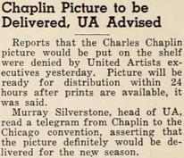 within 24 hours after prints are available, it was said. Murray Silverstone, head of UA, read a telegram from Chaplin