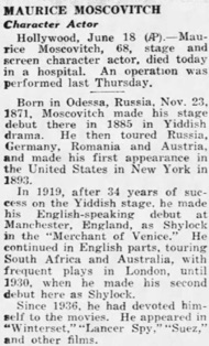 Hollywood, June 18 (AP). – Maurice Moscovitch, 68,