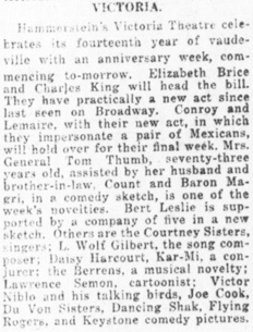 a conjurer; the Berrens, a musical novelty; Lawrence Semon, cartoonist; Victor Niblo and his talking birds, Joe Cook,