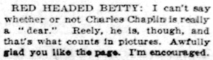 „READ HEADED BETTY: I can‘t say whether or not Charles Chaplin is really a ,dear.‘ Reely, he is, though, and that‘s