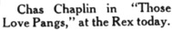 & Chas. Chaplin in „Those Love Pangs,“ at the Rex today.