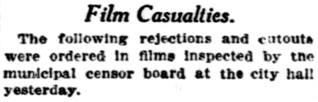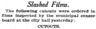 The following cutouts were ordered in films inspected by the municipal censor board at the city hall yesterday: