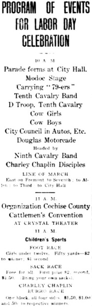 Celebration. 10 A. M. Parade forms at City Hall. Modoc Stage. Carrying ,79-ers‘. Tenth Cavalry Band. D Troop. Tenth